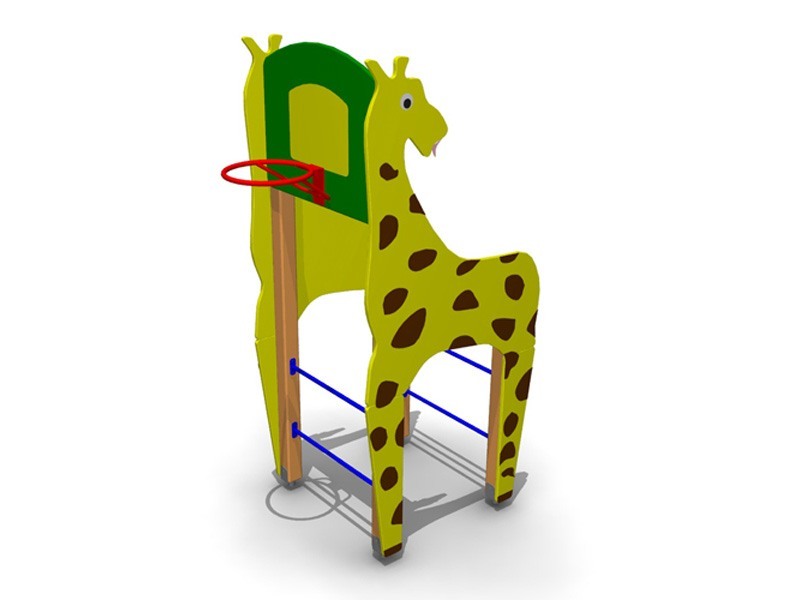 Гимнастический комплекс представляет собой сборноразборную конструкцию стилизованную под жирафа, состоящую из четырех опорных столбов, баскетбольного щита с кольцом, распорных турников и декоративных фанерных элементов. На вершины столбов устанавливаются пластиковые заглушки. Оборудование устанавливается и бетонируется на оцинкованные металлические подпятники. Возраст пользователя от 3 до 7 лет. Опорные столбы выполнены из клееного бруса сечением не менее 100*100 мм. с канавкой посередине. Металлические подпятники выполнены из круглой трубы сечением не менее 42 мм. и листового металла толщиной не менее 4 мм.  Распорные турники выполнены из круглой трубы сечением не менее 27 мм. и листового металла толщиной не менее 4 мм. Декоративные элементы выполнены из влагостойкой фанеры толщиной не менее 24 мм. Все металлические и фанерные элементы выполнены с применением высокоточного оборудования. Деревянные элементы изготавливаются на полуавтоматизированной линии по обработке деревянных изделий. Все деревянные элементы изготавливаются из хвойной доски влажностью 7-10%, подвергаемой склейке по длине и ширине заготовки с применением клеев зарубежных производителей; изгибы, радиусы и скругленные кромки тщательно отшлифованы и обработаны краской для закрытия торцов JRM (ГОСТ Р 52169-2012 п.4.3.11). Все деревянные элементы проходят окраску в три слоя: первый слой – грунтование заготовки с последующим шлифованием поверхности, второй слой – покраска вододисперсионной краской с последующим шлифованием поверхности, третий слой – финишная покраска. Все деревянные элементы окрашиваются краской финского производителя TEKNOS, соответствующей требованиям санитарных норм и экологической безопасности. Все металлические элементы изготавливаются из круглых труб, с применением горячекатаного листа. Весь применяемый металлопрокат соответствует ГОСТ 10705-80, ГОСТ 1577-93. Сварные швы конструкций из металла гладкие (ГОСТ Р 52169-2012 п.4.3.10). Все металлические элементы окрашиваются порошковой краской финского производителя TEKNOS, соответствующей требованиям санитарных норм и экологической безопасности. Для более качественного прокраса все металлические элементы проходят двойной цикл покраски. Все фанерные элементы изготовлены из многослойной влагостойкой, склеенной под прессом и соответствующей ГОСТ 30427-96 фанеры; изгибы, радиусы и скругленные кромки тщательно отшлифованы и обработаны краской для закрытия торцов JRM (ГОСТ Р 52169-2012 п.4.3.11). Окраска фанерных элементов происходит в три слоя: первый слой – грунтование заготовки с последующим шлифованием поверхности, второй слой – покраска двухкомпонентной краской с последующим шлифованием поверхности, третий слой – финишная покраска. Все фанерные элементы окрашиваются краской финского производителя TEKNOS, соответствующей требованиям санитарных норм и экологической безопасности. Крепеж оцинкован. Выступающие части резьбовых соединений закрыты пластиковыми заглушками (ГОСТ Р 52169-2012 п. 4.3.9). Крепление элементов оборудования исключает возможность их демонтажа без применения инструментов (ГОСТ Р 52169-2012 п. 4.3.13). Изделие сопровождается: а) техническим паспортом завода-изготовителя (ГОСТ Р 52301-2004 п. 5), в котором указано предназначение, номер изделия, правила безопасной эксплуатации и схема сборки. б) комплектом креп