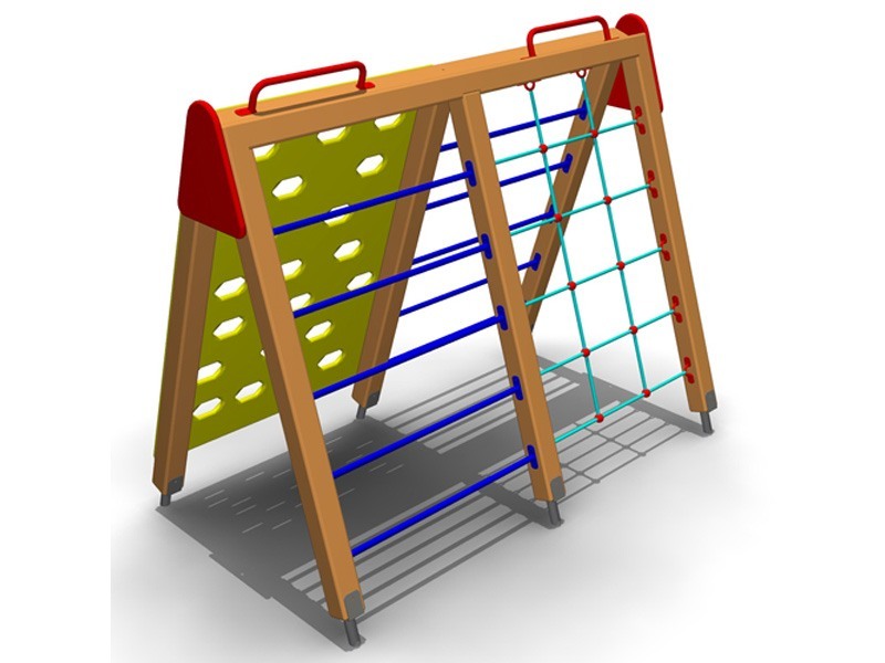 Гимнастический комплекс представляет собой сборноразборную, модульную конструкцию, состоящую из шести опорных столбов, закладного бруса, скалолаза, распорных турников, сетки, двух ручек-держателей и фанерных фиксаторов. Оборудование устанавливается и бетонируется на оцинкованные металлические подпятники. Возраст пользователя от 6 до 12 лет. Опорные столбы и закладной брус выполнены из клееного бруса сечением не менее 100*100 мм. с канавкой посередине. Металлические подпятники выполнены из круглой трубы сечением не менее 42 мм. и листового металла толщиной не менее 4 мм. Распорные турники выполнены из круглой трубы сечением не менее 34 мм., листового металла толщиной не менее 4 мм. Ручки-держатели выполнены из круглой трубы сечением не менее 27 мм. и листового металла толщиной не менее 4 мм. Скалолаз и фиксаторы выполнены из влагостойкой фанеры толщиной не менее 24 мм. Сетка выполнена из полипропиленового каната с металлическим сердечником сечением не менее 16 мм. и специальных крепежных метизов. Все металлические и фанерные элементы выполнены с применением высокоточного оборудования. Деревянные элементы изготавливаются на полуавтоматизированной линии по обработке деревянных изделий. Все деревянные элементы изготавливаются из хвойной доски влажностью 7-10%, подвергаемой склейке по длине и ширине заготовки с применением клеев зарубежных производителей; изгибы, радиусы и скругленные кромки тщательно отшлифованы и обработаны краской для закрытия торцов JRM (ГОСТ Р 52169-2012 п.4.3.11). Все деревянные элементы проходят окраску в три слоя: первый слой – грунтование заготовки с последующим шлифованием поверхности, второй слой – покраска вододисперсионной краской с последующим шлифованием поверхности, третий слой – финишная покраска. Все деревянные элементы окрашиваются краской финского производителя TEKNOS, соответствующей требованиям санитарных норм и экологической безопасности. Все металлические элементы изготавливаются из круглых труб, с применением горячекатаного листа. Весь применяемый металлопрокат соответствует ГОСТ 10705-80, ГОСТ 1577-93. Сварные швы конструкций из металла гладкие (ГОСТ Р 52169-2012 п.4.3.10). Все металлические элементы окрашиваются порошковой краской финского производителя TEKNOS, соответствующей требованиям санитарных норм и экологической безопасности. Для более качественного прокраса все металлические элементы проходят двойной цикл покраски. Все фанерные элементы изготовлены из многослойной влагостойкой, склеенной под прессом и соответствующей ГОСТ 30427-96 фанеры; изгибы, радиусы и скругленные кромки тщательно отшлифованы и обработаны краской для закрытия торцов JRM (ГОСТ Р 52169-2012 п.4.3.11). Окраска фанерных элементов происходит в три слоя: первый слой – грунтование заготовки с последующим шлифованием поверхности, второй слой – покраска двухкомпонентной краской с последующим шлифованием поверхности, третий слой – финишная покраска. Все фанерные элементы окрашиваются краской финского производителя TEKNOS, соответствующей требованиям санитарных норм и экологической безопасности. Крепеж оцинкован. Выступающие части резьбовых соединений закрыты пластиковыми заглушками (ГОСТ Р 52169-2012 п. 4.3.9). Крепление элементов оборудования исключает возможность их демонтажа без применения инструментов (ГОСТ Р 52169-2012 п. 4.3.13). Изделие соп
