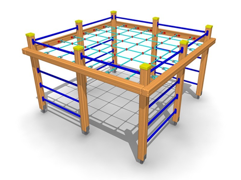 Гимнастический комплекс представляет собой сборноразборную, модульную конструкцию, состоящую из восьми опорных столбов, четырех закладных брусьев, сетки и гимнастических стенок из распорных турников. Оборудование устанавливается и бетонируется на оцинкованные металлические подпятники. Возраст пользователя от 6 лет.Опорные столбы и закладные брусья выполнены из клееного бруса сечением не менее 100*100 мм. с канавкой посередине. Металлические подпятники выполнены из круглой трубы сечением не менее 42 мм. и листового металла толщиной не менее 4 мм.  Распорные турники выполнены из круглой трубы сечением не менее 27 мм. и листового металла толщиной не менее 4 мм. Сетка выполнена из полипропиленового каната с металлическим сердечником сечением не менее 16 мм. и специальных крепежных метизов. Все металлические и фанерные элементы выполнены с применением высокоточного оборудования. Деревянные элементы изготавливаются на полуавтоматизированной линии по обработке деревянных изделий.Все деревянные элементы изготавливаются из хвойной доски влажностью 7-10%, подвергаемой склейке по длине и ширине заготовки с применением клеев зарубежных производителей; изгибы, радиусы и скругленные кромки тщательно отшлифованы и обработаны краской для закрытия торцов JRM (ГОСТ Р 52169-2012 п.4.3.11). Все деревянные элементы проходят окраску в три слоя: первый слой – грунтование заготовки с последующим шлифованием поверхности, второй слой – покраска вододисперсионной краской с последующим шлифованием поверхности, третий слой – финишная покраска. Все деревянные элементы окрашиваются краской финского производителя TEKNOS, соответствующей требованиям санитарных норм и экологической безопасности.Все металлические элементы изготавливаются из круглых труб, с применением горячекатаного листа. Весь применяемый металлопрокат соответствует ГОСТ 10705-80, ГОСТ 1577-93. Сварные швы конструкций из металла гладкие (ГОСТ Р 52169-2012 п.4.3.10). Все металлические элементы окрашиваются порошковой краской финского производителя TEKNOS, соответствующей требованиям санитарных норм и экологической безопасности. Для более качественного прокраса все металлические элементы проходят двойной цикл покраски. Все фанерные элементы изготовлены из многослойной влагостойкой, склеенной под прессом и соответствующей ГОСТ 30427-96 фанеры; изгибы, радиусы и скругленные кромки тщательно отшлифованы и обработаны краской для закрытия торцов JRM (ГОСТ Р 52169-2012 п.4.3.11). Окраска фанерных элементов происходит в три слоя: первый слой – грунтование заготовки с последующим шлифованием поверхности, второй слой – покраска двухкомпонентной краской с последующим шлифованием поверхности, третий слой – финишная покраска. Все фанерные элементы окрашиваются краской финского производителя TEKNOS, соответствующей требованиям санитарных норм и экологической безопасности.Крепеж оцинкован. Выступающие части резьбовых соединений закрыты пластиковыми заглушками (ГОСТ Р 52169-2012 п. 4.3.9).Крепление элементов оборудования исключает возможность их демонтажа без применения инструментов (ГОСТ Р 52169-2012 п. 4.3.13).Изделие сопровождается:а) техническим паспортом завода-изготовителя (ГОСТ Р 52301-2004 п. 5), в котором указано предназначение, номер изделия, правила безопасной эксплуатации и схема сборки.б) комплектом крепежа для сборки и мо