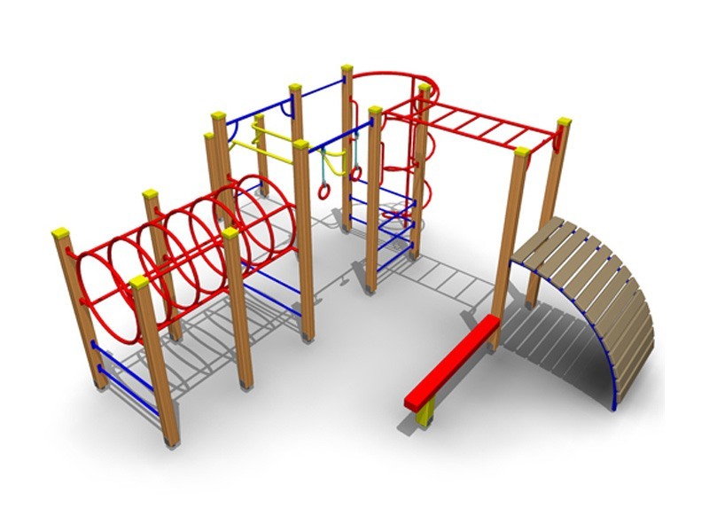 Гимнастический комплекс представляет собой сборноразборную, модульную конструкцию, состоящую из четырнадцати опорных столбов, снаряда «Трап», трубы для спуска «Спираль», рукохода, кольцевого тоннеля, распорных турников, турника под гимнастические кольца, усиленного турника, гимнастических брусьев, гимнастических колец, ручек-держателей и бум-бревна. На вершины столбов устанавливаются пластиковые заглушки. Оборудование устанавливается и бетонируется на оцинкованные металлические подпятники. Возраст пользователя от 10 до 14 лет. Опорные столбы выполнены из клееного бруса сечением не менее 100*100 мм. с канавкой посередине. Бум-бревно выполнено из клееного бруса сечением не менее 140*100 мм.  Металлические подпятники, гимнастические брусья и труба для спуска «Спираль» выполнены из круглой трубы сечением не менее 42 мм. и листового металла толщиной не менее 4 мм. Снаряд «Трап» выполнен из круглой трубы сечением не менее 34 мм., листового металла толщиной не менее 4 мм., горячекатаного круга сечением не менее 12 мм. и хвойной доски влажностью 7-10% сечением не менее 40*120 мм. Рукоход, кольцевой тоннель, турник под гимнастические кольца и усиленный турник выполнены из круглой трубы сечением не менее 34 мм. и  листового металла толщиной не менее 4 мм.  Распорные турники и ручки-держатели выполнены из круглой трубы сечением не менее 27 мм. и листового металла толщиной не менее 4 мм. Все металлические и фанерные элементы выполнены с применением высокоточного оборудования. Деревянные элементы изготавливаются на полуавтоматизированной линии по обработке деревянных изделий. Все деревянные элементы изготавливаются из хвойной доски влажностью 7-10%, подвергаемой склейке по длине и ширине заготовки с применением клеев зарубежных производителей; изгибы, радиусы и скругленные кромки тщательно отшлифованы и обработаны краской для закрытия торцов JRM (ГОСТ Р 52169-2012 п.4.3.11). Все деревянные элементы проходят окраску в три слоя: первый слой – грунтование заготовки с последующим шлифованием поверхности, второй слой – покраска вододисперсионной краской с последующим шлифованием поверхности, третий слой – финишная покраска. Все деревянные элементы окрашиваются краской финского производителя TEKNOS, соответствующей требованиям санитарных норм и экологической безопасности. Все металлические элементы изготавливаются из круглых труб, с применением горячекатаного листа. Весь применяемый металлопрокат соответствует ГОСТ 8639-82, ГОСТ 535-88, ГОСТ 10705-80, ГОСТ 1577-93. Сварные швы конструкций из металла гладкие (ГОСТ Р 52169-2012 п.4.3.10). Все металлические элементы окрашиваются порошковой краской финского производителя TEKNOS, соответствующей требованиям санитарных норм и экологической безопасности. Для более качественного прокраса все металлические элементы проходят двойной цикл покраски. Все фанерные элементы изготовлены из многослойной влагостойкой, склеенной под прессом и соответствующей ГОСТ 30427-96 фанеры; изгибы, радиусы и скругленные кромки тщательно отшлифованы и обработаны краской для закрытия торцов JRM (ГОСТ Р 52169-2012 п.4.3.11). Окраска фанерных элементов происходит в три слоя: первый слой – грунтование заготовки с последующим шлифованием поверхности, второй слой – покраска двухкомпонентной краской с последующим шлифованием поверхности, третий слой – финишная покр