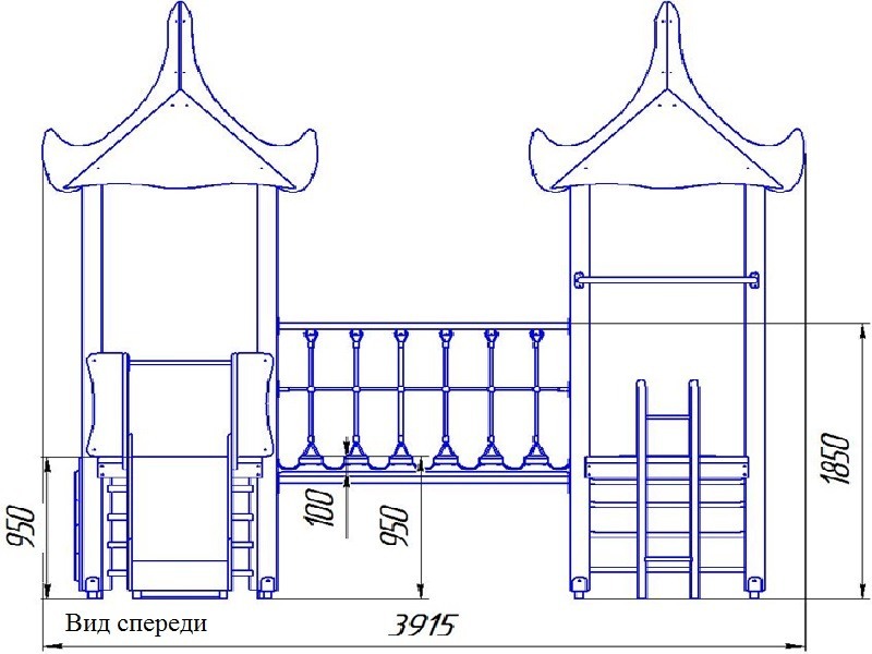 Игровой комплекс представляет собой сборноразборную, модульную конструкцию, состоящую из восьми опорных столбов, двух площадок, двух башен под шатровыми крышами, одного лестничного марша, двух перил к лестничному маршу, выполненных в виде металлического каркаса с фанерными экранами, одного подвесного моста со страховочным полом на металлическом каркасе, соединяющем площадки, одного ската горки с высотой стартового участка 950мм, одного снаряда «скалолаз» со стойкой для подъема, одной гимнастической стенки из турников, одного снаряда для съезжания с ручкой, одного снаряда для подъема «лиана» с перилами, турников. Оборудование устанавливается и бетонируется на оцинкованные металлические подпятники. Возраст пользователя от 5 лет.Опорные столбы выполнены из клееного бруса сечением не менее 100мм*100мм с канавкой посередине. Площадки выполнены из доски сечением не менее 100мм*40мм. Металлические подпятники, выполнены из круглой трубы сечением не менее 42мм и листового металла толщиной не менее 4мм. Шатровая крыша выполнена из фанеры толщиной не менее 15мм и листового металла толщиной 4мм. Лестничный марш выполнен из сухой доски сечением не менее 140мм*40мм. Перила к лестничному маршу выполнены из круглой трубы сечением не менее 27мм, листового металла толщиной не менее 4мм и фанеры толщиной не менее 15мм. Подвесной пол представляет собой конструкцию из подвешенных к перилам на полипропиленовых канат клееных досок. Перила выполнены из профильной трубы сечением не менее 40мм*40мм и листового металла толщиной не менее 4мм. Доски – комбинированные, выполнены из сухой доски сечением не менее 120мм*30мм и ламинированной нескользящей фанеры толщиной не менее 24мм, склеенных между собой под прессом. Страховочный пол выполнен из профильной трубы сечением не менее 40мм*20мм, листового металла толщиной не менее 4мм и влагостойкой ламинированной фанеры толщиной не менее 24мм. Скат горки выполнен из фанеры толщиной не менее 24мм и единого листа нержавеющей стали толщиной не менее 1,5мм. Скат горки имеет металлический каркас, выполненный из профильной трубы сечением не менее 20мм*40мм. Стартовый участок горки имеет ограждения, выполненные из фанеры толщиной 24мм и имеет турник – ограничитель, выполненный из круглой трубы сечением не менее 27мм и листового металла толщиной 4мм. Снаряд «скалолаз» выполнен из фанеры толщиной не менее 24мм. Стойка для подъема имеет п-образную форму и выполнена из круглой трубы сечением не менее 27мм и листового металла толщиной 4мм. Распорные турники гимнастической стенки выполнены из круглой трубы сечением 27мм и листового металла толщиной 4мм. Снаряд для съезжания имеет зигзагообразную форму и выполнен из круглой трубы сечением не менее 42мм и листового металла толщиной не менее 4мм. Ручка выполнена из круглой трубы сечением не менее 34 мм и листового металла толщиной не менее 4мм. Снаряд «лиана» выполнен в виде п-образных ступеней и изготовлен из круглой трубы сечением не менее 42 мм и листового металла толщиной не менее 4мм. Турники выполнены из круглой трубы сечением не менее 27мм и листового металла толщиной 4мм. Все металлические элементы выполнены с применением высокоточного оборудования. Деревянные и фанерные элементы изготавливаются на полуавтоматизированной линии по обработке деревянных и фанерных изделий.Все деревян