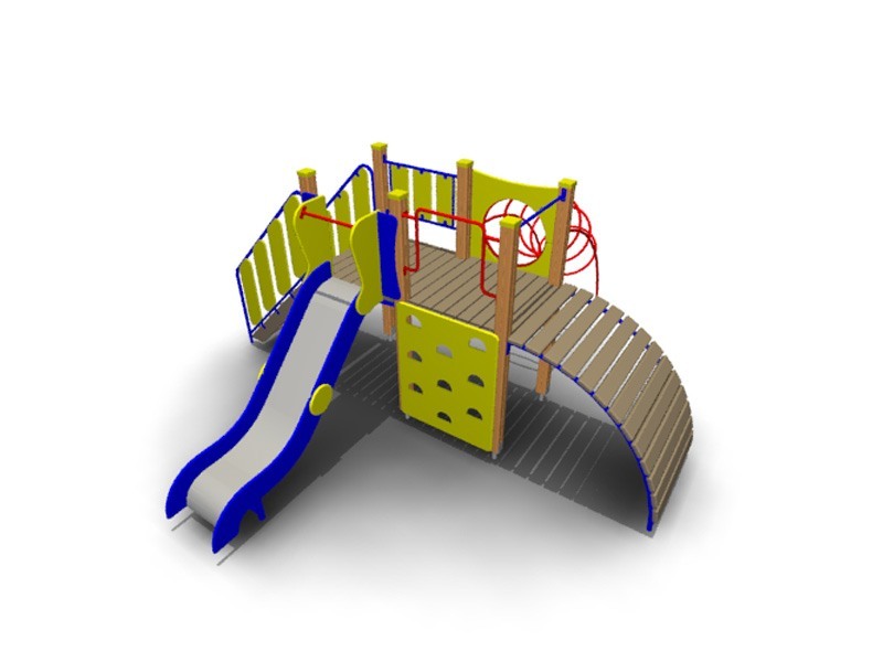 Игровой комплекс представляет собой сборноразборную, модульную конструкцию, состоящую из шести опорных столбов, одной прямоугольной площадки, одного ограждения, выполненного в виде металлического каркаса с фанерными экранами, одного ската горки с высотой стартового участка не менее 1200 мм., одного снаряда «скалолаз» со стойкой для подъема, одного лестничного марша с двумя перилами, выполненными в виде металлического каркаса с фанерными экранами, одного снаряда для подъема «трап» с полипропиленовым канатом, одного кольцевого снаряда для лазания с фанерным лазом, турников. Оборудование устанавливается и бетонируется на оцинкованные металлические подпятники. Возраст пользователя от 5 лет.Опорные столбы выполнены из клееного бруса сечением не менее 100*100 мм. с канавкой посередине. Площадка выполнена из доски сечением не менее 100*40 мм. Металлические подпятники, выполнены из круглой трубы сечением не менее 42 мм. и листового металла толщиной не менее 4 мм. Лестничный марш выполнен из сухой доски сечением не менее 140*40 мм. Перила к лестничному маршу выполнены из круглой трубы сечением не менее 27 мм., листового металла толщиной не менее 4 мм. и фанеры толщиной не менее 15 мм. Ограждение выполнено из круглой трубы сечением не менее 27 мм., листового металла толщиной не менее 4 мм. и фанеры толщиной не менее 15 мм. Скат горки выполнен из фанеры толщиной не менее 24 мм. и единого листа нержавеющей стали толщиной не менее 1,5 мм. Скат горки имеет металлический каркас, выполненный из профильной трубы сечением не менее 20*40 мм. Стартовый участок горки имеет ограждения, выполненные из фанеры толщиной 24 мм. и имеет турник – ограничитель, выполненный из круглой трубы сечением не менее 27 мм. и листового металла толщиной 4 мм. Снаряд «скалолаз» выполнен из фанеры толщиной не менее 24 мм. Стойка для подъема имеет п-образную форму и выполнена из круглой трубы сечением не менее 27 мм. и листового металла толщиной 4 мм. Снаряд «трап» выполнен в виде металлического каркаса с досками. Каркас выполнен из круглой трубы сечением не менее 42 мм. и листового металла толщиной не менее 4 мм., доски выполнены из сухой доски сечением не менее 120*40 мм. Полипропиленовый канат фиксируется между столбов при помощи распорного турника с петлей, выполненного из круглой трубы сечением не менее 27 мм. и листового металла толщиной не менее 4 мм. Кольцевой тоннель представляет собой конструкцию из колец, расположенных последовательно друг за другом повторяя окружность и выполнен из круглой трубы сечением не менее 27 мм. и листового металла толщиной 4 мм. Фанерный лаз выполнен из фанеры толщиной не менее 24 мм. Турники выполнены из круглой трубы сечением не менее 27 мм. и листового металла толщиной не менее 4 мм. Все металлические элементы выполнены с применением высокоточного оборудования. Деревянные и фанерные элементы изготавливаются на полуавтоматизированной линии по обработке деревянных и фанерных изделий.Все деревянные элементы изготавливаются из хвойной доски влажностью 7-10%, подвергаемой склейке по длине и ширине заготовки с применением клеев зарубежных производителей; изгибы, радиусы и скругленные кромки тщательно отшлифованы и обработаны краской для закрытия торцов JRM (ГОСТ Р 52169-2003 п.4.3.11). Все деревянные элементы проходят окраску в три слоя: первый слой – грунтование заготовки 