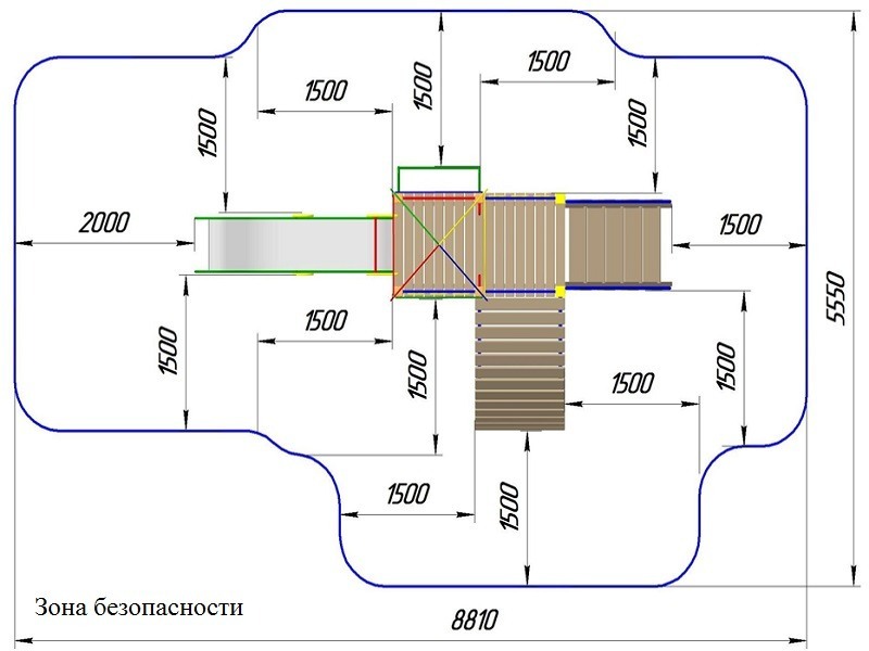 Игровой комплекс представляет собой сборноразборную, модульную конструкцию, состоящую из шести опорных столбов, две разноуровневые площадки, одной башней под крестообразной крышей, двух ограждений, выполненных в виде металлического каркаса с фанерными экранами, одной гимнастической стенки из турников, одного ската горки с высотой стартового участка не менее 1450мм, одного лестничного марша с двумя перилами, выполненными в виде металлического каркаса с фанерными экранами, одного снаряда для подъема «трап» с полипропиленовым канатом, турников. Оборудование устанавливается и бетонируется на оцинкованные металлические подпятники. Возраст пользователя от 7 лет. Опорные столбы выполнены из клееного бруса сечением не менее 100мм*100мм с канавкой посередине. Площадки выполнены из доски сечением не менее 100мм*40мм. Металлические подпятники, выполнены из круглой трубы сечением не менее 42мм и листового металла толщиной не менее 4мм. Крестообразная крыша выполнена из фанеры толщиной не менее 15мм и листового металла толщиной 4мм. Лестничный марш выполнен из сухой доски сечением не менее 140мм*40мм. Перила к лестничному маршу выполнены из круглой трубы сечением не менее 27мм, листового металла толщиной не менее 4мм и фанеры толщиной не менее 15мм. Ограждение выполнено из круглой трубы сечением не менее 27мм, листового металла толщиной не менее 4мм и фанеры толщиной не менее 15мм. Турники гимнастической стенки выполнены из круглой трубы сечением не менее 27мм и листового металла толщиной не менее 4мм. Скат горки выполнен из фанеры толщиной не менее 24мм и единого листа нержавеющей стали толщиной не менее 1,5мм. Скат горки имеет металлический каркас, выполненный из профильной трубы сечением не менее 20мм*40мм. Стартовый участок горки имеет ограждения, выполненные из фанеры толщиной 24мм и имеет турник – ограничитель, выполненный из круглой трубы сечением не менее 27мм и листового металла толщиной 4мм. Снаряд «трап» выполнен в виде металлического каркаса с досками. Каркас выполнен из круглой трубы сечением не менее 42мм и листового металла толщиной не менее 4мм, доски выполнены из сухой доски сечением не менее 120мм*40мм. Полипропиленовый канат фиксируется между столбов при помощи распорного турника с петлей, выполненного из круглой трубы сечением не менее 27мм и листового металла толщиной не менее 4мм. Все металлические элементы выполнены с применением высокоточного оборудования. Деревянные и фанерные элементы изготавливаются на полуавтоматизированной линии по обработке деревянных и фанерных изделий. Все деревянные элементы изготавливаются из хвойной доски влажностью 7-10%, подвергаемой склейке по длине и ширине заготовки с применением клеев зарубежных производителей; изгибы, радиусы и скругленные кромки тщательно отшлифованы и обработаны краской для закрытия торцов JRM (ГОСТ Р 52169-2003 п.4.3.11). Все деревянные элементы проходят окраску в три слоя: первый слой – грунтование заготовки с последующим шлифованием поверхности, второй слой – покраска вододисперсионной краской с последующим шлифованием поверхности, третий слой – финишная покраска. Все деревянные элементы окрашиваются краской финского производителя TEKNOS, соответствующей требованиям санитарных норм и экологической безопасности. Все металлические элементы изготавливаются из круглых тр