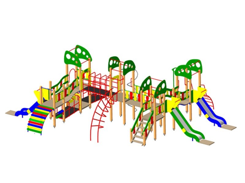 Игровой комплекс представляет собой сборноразборную, модульную конструкцию, состоящую из двадцати четырех опорных столбов, семи разноуровневых площадок, четырех башен под фанерной имитацией крыши с шестью кругами, одна из башен имеет двухъярусные площадки, одного снаряда «трап», в виде полукруглой конструкции со ступенями и перилами, четырех ограждений в виде металлических каркасов с фанерными экранами, одного шеста для спуска с ручками и дополнительными ступенями, одного снаряда «трап» с полипропиленовым канатом, трех разновысоких скатов горки с высотами площадок не менее 1200мм и 1450мм, двух волнистых полов с перилами, выполненными в виде фанерного каркаса с экранами, одного шеста со спиралью и ручками и дополнительными ступенями, одного снаряда «скалолаз» со стойкой для подъема, одного закрытого кольцевого перехода с фанерным полом, двух закрытых кольцевых входов, турников, одного подвесного моста на полипропиленовых канатах со страховочным полом, одного снаряда «лиана», выполненного в виде полукруглой конструкции с металлическими ступенями и ручкой, двадцати счет на металлических направляющих. На вершины столбов устанавливаются пластиковые заглушки. Оборудование устанавливается и бетонируется на оцинкованные металлические подпятники. Возраст пользователя от 7 лет.   Опорные столбы выполнены из клееного бруса сечением не менее 100мм*100мм с канавкой посередине. Площадки выполнены из доски сечением не менее 100мм*40мм. Металлические подпятники выполнены из круглой трубы сечением не менее 42мм и листового металла толщиной не менее 4мм. Имитация крыши выполнены из фанерных экранов толщиной не менее 24мм; распорные турники выполнены из круглой трубы сечением не менее 27мм и листового металла толщиной не менее 4мм. Лестничный марш выполнен из сухой доски сечением не менее 140мм*40мм. Перила к лестничному маршу выполнены из сухой доски сечением не менее 140мм*40мм и фанеры толщиной не менее 15мм. Ограждения выполнено из круглой трубы сечением не менее 27мм, листового металла толщиной не менее 4мм и фанеры толщиной не менее 15мм. Скатs горок выполнены из фанеры толщиной не менее 24мм и единого листа нержавеющей стали толщиной не менее 1,5мм. Скат горки имеет металлический каркас, выполненный из профильной трубы сечением не менее 20мм*40мм. Стартовый участок горки имеет ограждения, выполненные из фанеры толщиной 24мм и имеет турник – ограничитель, выполненный из круглой трубы сечением не менее 27мм и листового металла толщиной 4мм. Счеты выполнены из фанеры толщиной не менее 24мм. Металлические направляющие счет выполнены из трубы сечением не менее 21мм. Волнистый пол выполнен в виде металлического каркаса с досками и изготовлен из круглой трубы сечением не менее 42мм, листового металла толщиной не менее 4мм и доски сечением не менее 100мм*40мм. Перила к волнистому полу изготовлены из фанеры толщиной не менее 24мм. Снаряд «трап» выполнен в виде металлического каркаса с досками. Каркас выполнен из круглой трубы сечением не менее 42мм и листового металла толщиной не менее 4мм, доски выполнены из сухой доски сечением не менее 120мм*40мм. Полипропиленовый канат фиксируется между столбов при помощи распорного турника с петлей, выполненного из круглой трубы сечением не менее 27мм и листового металла толщиной не менее 4мм. Закрытые кольцевые переход и 