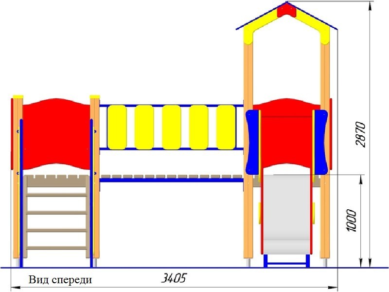 Игровой комплекс представляет собой сборноразборную, модульную конструкцию, состоящую из восьми опорных столбов, двух одноуровневых площадок, одной башни с двухскатной крышей, четырех ограждений в виде фанерных экранов, одного ската горки с высотой площадки не менее 950мм, одного лестничного марша с перилами, выполненными как металлический каркас с фанерными экранами, одного перехода, выполненного как доски на металлическом каркасе, с перилами, выполненными как металлический каркас с фанерными экранами. На вершины столбов устанавливаются пластиковые заглушки. Оборудование устанавливается и бетонируется на оцинкованные металлические подпятники. Возраст пользователя от 3 лет.   Опорные столбы выполнены из клееного бруса сечением не менее 100мм*100мм с канавкой посередине. Площадки выполнены из доски сечением не менее 100мм*40мм. Металлические подпятники выполнены из круглой трубы сечением не менее 42мм и листового металла толщиной не менее 4мм. Скаты крыши выполнены из фанеры толщиной не менее 15мм. Фронтоны выполнены из фанеры толщиной не менее 24мм. Лестничный марш выполнен из сухой доски сечением не менее 140мм*40мм. Перила к лестничному маршу выполнены из круглой трубы сечением не менее 34мм, листового металла толщиной не менее 4мм и фанеры толщиной не менее 15мм. Ограждения выполнены из фанеры толщиной не менее 24мм. Переход выполнен из круглой трубы сечением не менее 42мм, листового металла толщиной не менее 4мм и сухой доски сечением не менее 100мм*40мм. Перила перехода выполнены из круглой трубы сечением не менее 34мм, листового металла толщиной не менее 4мм и фанеры толщиной не менее 15мм. Скат горки выполнены из фанеры толщиной не менее 24мм и единого листа нержавеющей стали толщиной не менее 1,5мм. Скат горки имеет металлический каркас, выполненный из профильной трубы сечением не менее 20мм*40мм. Стартовый участок горки имеет ограждения, выполненные из фанеры толщиной 24мм и имеет турник – ограничитель, выполненный из круглой трубы сечением не менее 27мм и листового металла толщиной 4мм. Все металлические элементы выполнены с применением высокоточного оборудования. Деревянные и фанерные элементы изготавливаются на полуавтоматизированной линии по обработке деревянных и фанерных изделий.   Все деревянные элементы изготавливаются из хвойной доски влажностью 7-10%, подвергаемой склейке по длине и ширине заготовки с применением клеев зарубежных производителей; изгибы, радиусы и скругленные кромки тщательно отшлифованы и обработаны краской для закрытия торцов JRM (ГОСТ Р 52169-2003 п.4.3.11). Все деревянные элементы проходят окраску в три слоя: первый слой – грунтование заготовки с последующим шлифованием поверхности, второй слой – покраска вододисперсионной краской с последующим шлифованием поверхности, третий слой – финишная покраска. Все деревянные элементы окрашиваются краской финского производителя TEKNOS, соответствующей требованиям санитарных норм и экологической безопасности. Все металлические элементы изготавливаются из круглых труб, с применением горячекатаного листа. Весь применяемый металлопрокат соответствует ГОСТ 10705-80, ГОСТ 1577-93. Сварные швы конструкций из металла гладкие (ГОСТ Р 52169-2012 п.4.3.10). Все металлические элементы окрашиваются порошковой краской финского производителя TEKNOS, соответствующей требованиям санитарны