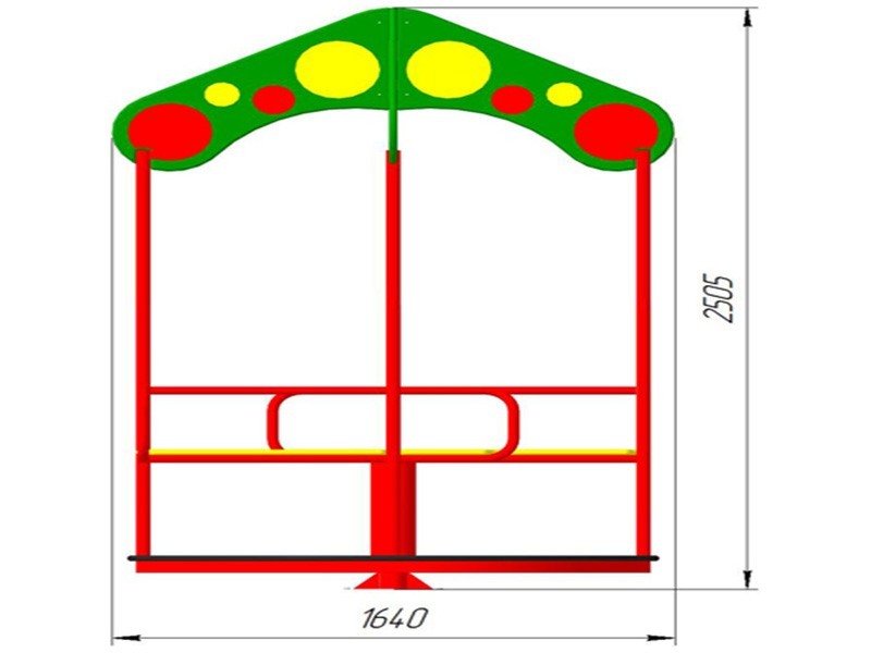 Карусель выполнена как не разборная металлическая конструкция с четырьмя полами, имитацией крыши, четырьмя перилами и четырьмя сидениями. Карусель устанавливается и бетонируется в грунт при помощи основания для бетонирования. Возраст пользователя от 3 до 12 лет. Крутящийся механизм выполнен на токарном механизме, из горячекатаного круга сечением не менее 80мм, круглой трубы сечением не менее 133мм, листового металла толщиной не менее 8мм. Крутящийся механизм карусели имеет два износостойких радиально упорных подшипника. Каркас пола выполнен из профильной трубы сечением не менее 50мм*25мм, круглой трубы сечением не менее 42мм и листового металла толщиной не менее 8мм. Сидения выполнены из круглой трубы сечением не менее 34мм и влагостойкой фанеры толщиной не менее 24мм. Перила выполнены из круглой трубы сечением не менее 34мм. Полы выполнены из ламинированной фанеры с противоскользящим покрытием толщиной не менее 24мм. Имитация крыши выполнена из влагостойкой фанеры толщиной не менее 24мм. Основание для бетонирования выполнено из равнополочного уголка сечением не менее 25мм*25мм и шпильки диаметром не менее 20мм. Все металлические элементы выполнены с применением высокоточного оборудования. Фанерные элементы изготавливаются на полуавтоматизированной линии по обработке изделий. Все металлические элементы изготавливаются из круглых труб, с применением горячекатаного листа. Весь применяемый металлопрокат соответствует ГОСТ 535-88, ГОСТ 8509-93, ГОСТ 8639-93, ГОСТ 10705-80, ГОСТ 1577-93. Сварные швы конструкций из металла гладкие (ГОСТ Р 52169-2012 п.4.3.10). Все металлические элементы окрашиваются порошковой краской финского производителя TEKNOS, соответствующей требованиям санитарных норм и экологической безопасности. Для более качественного прокраса все металлические элементы проходят двойной цикл покраски. Все фанерные элементы изготовлены из многослойной влагостойкой, склеенной под прессом и соответствующей ГОСТ 30427-96 фанеры; изгибы, радиусы и скругленные кромки тщательно отшлифованы и обработаны краской для закрытия торцов JRM (ГОСТ Р 52169-2012 п.4.3.11). Окраска фанерных элементов происходит в три слоя: первый слой – грунтование заготовки с последующим шлифованием поверхности, второй слой – покраска двухкомпонентной краской с последующим шлифованием поверхности, третий слой – финишная покраска. Все фанерные элементы окрашиваются краской финского производителя TEKNOS, соответствующей требованиям санитарных норм и экологической безопасности. Крепеж оцинкован. Выступающие части резьбовых соединений закрыты пластиковыми заглушками (ГОСТ Р 52169-2012 п. 4.3.9). Крепление элементов оборудования исключает возможность их демонтажа без применения инструментов (ГОСТ Р 52169-2012 п. 4.3.13). Изделие сопровождается: а) техническим паспортом завода-изготовителя (ГОСТ Р 52301-2004 п. 5), в котором указано предназначение, номер изделия, правила безопасной эксплуатации и схема сборки. б) комплектом крепежа для сборки и монтажа. Сборочно-монтажные работы выполняются с соблюдением требований национальных стандартов по установке детского игрового оборудования и согласно схемам монтажа предприятия-изготовителя.