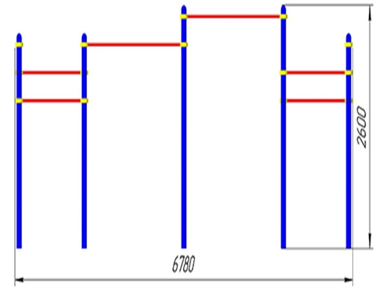 Спортивное оборудование СО-203.00.00 представляет собой сборно-разборную конструкцию, состоящую из десяти разновысоких стоек, двух разновысоких рукаходов и шести разновысоких турников для подтягивания и гимнастических упражнений, которые в свою очередь крепятся к стойкам при помощи металлических хомутов. На вершины столбов устанавливаются пластиковые заглушки. Оборудование устанавливается и бетонируется в грунт. Возраст пользователя от 14 лет.                        Опорные столбы выполнены из трубы сечением не менее 102мм и листового металла толщиной не менее 4мм. Рукаход выполнен из круглой трубы сечением не менее 27мм. Металлические хомуты, состоящие из двух половин, выполнены из листового металла, толщиной не менее 4мм. Все металлические элементы выполнены с применением высокоточного оборудования.   Все металлические элементы изготавливаются из круглых труб, с применением горячекатаного листа. Весь применяемый металлопрокат соответствует ГОСТ 8639-82, ГОСТ 10705-80, ГОСТ 1577-93. Сварные швы конструкций из металла гладкие (ГОСТ Р 52169-2012 п.4.3.10). Все металлические элементы окрашиваются порошковой краской финского производителя TEKNOS, соответствующей требованиям санитарных норм и экологической безопасности. Для более качественного прокраса все металлические элементы проходят двойной цикл покраски.   Крепеж оцинкован. Выступающие части резьбовых соединений закрыты пластиковыми заглушками (ГОСТ Р 52169-2012 п. 4.3.9). Крепление элементов оборудования исключает возможность их демонтажа без применения инструментов (ГОСТ Р 52169-2012 п. 4.3.13). Изделие сопровождается: а) техническим паспортом завода-изготовителя (ГОСТ Р 52301-2004 п. 5), в котором указано предназначение, номер изделия, правила безопасной эксплуатации и схема сборки. б) комплектом крепежа для сборки и монтажа. Сборочно-монтажные работы выполняются с соблюдением требований национальных стандартов по установке детского игрового оборудования и согласно схемам монтажа предприятия-изготовителя.
